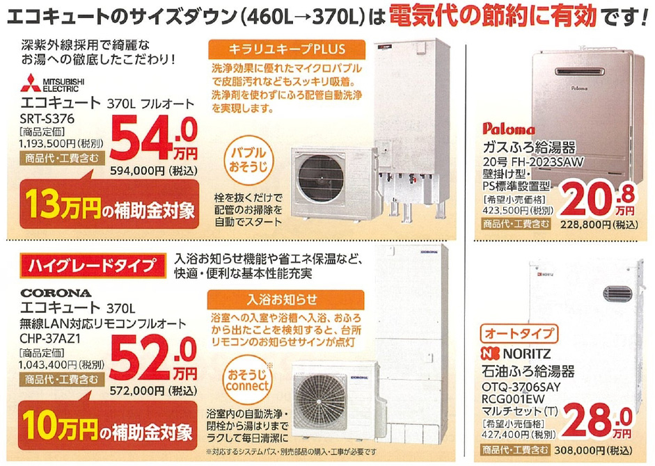 また、コロナエコキュートCHP-37AZ1は商品代・工賃含めて572,000円(税込)でご提供中!こちらも今なら10万円の補助金がもらえます!