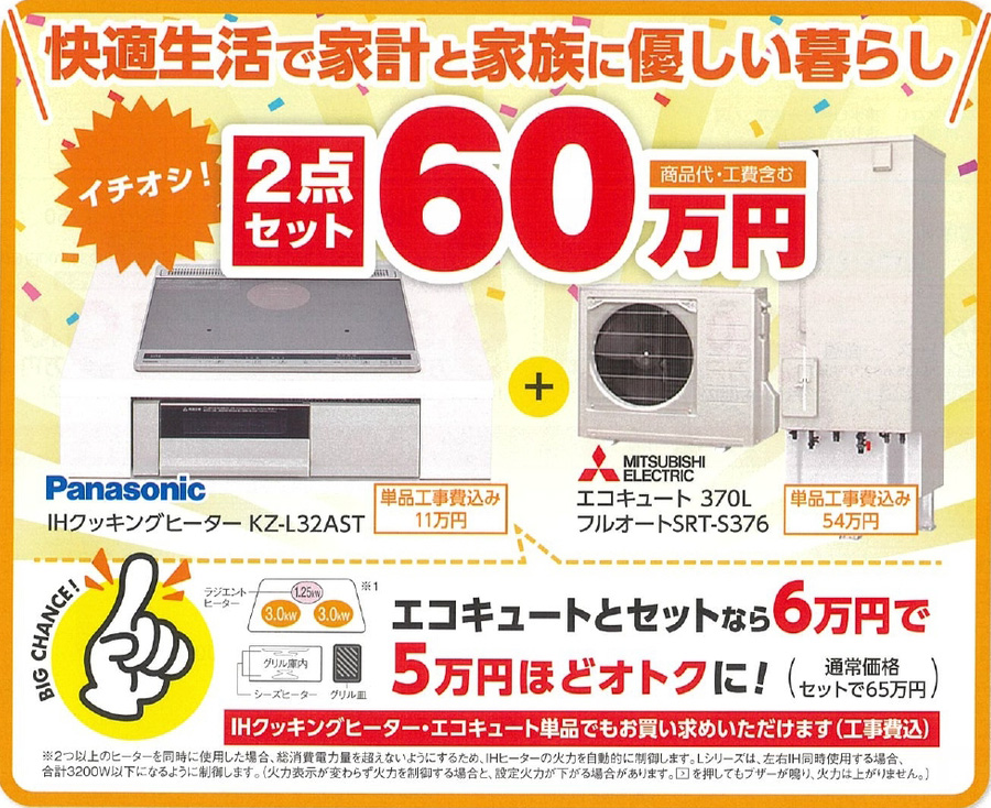 モリキュウでは、Panasonic IHクッキングヒーター KZ-L32ASTと、三菱エコキュート SRT-S376を商品代・工賃含めて2点セットで5万円おトクな60万円でご提供中!