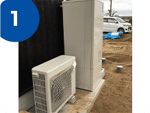 基礎台と、貯湯タンクとヒートポンプの位置関係を確認するため、全体が分かるように撮影してください。
